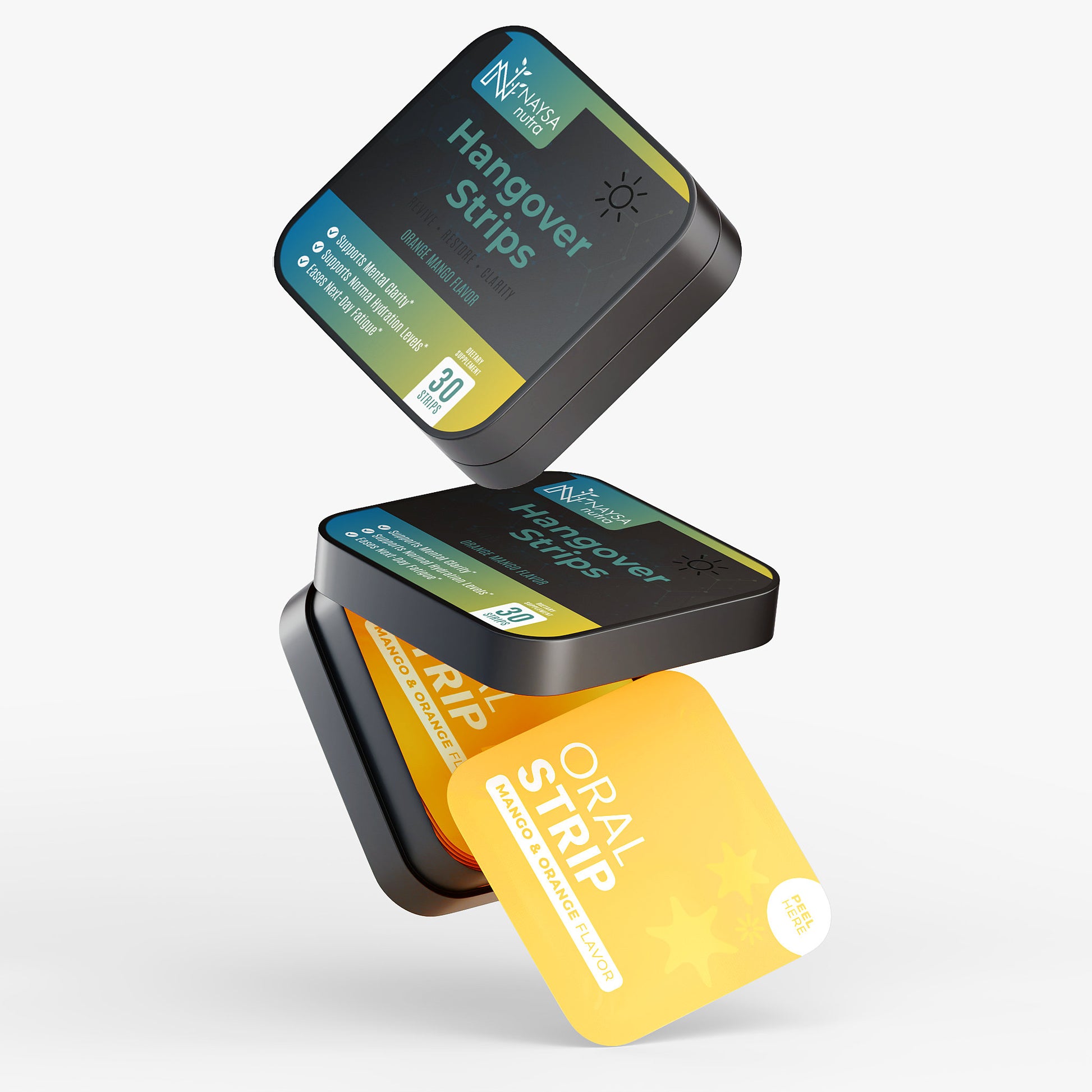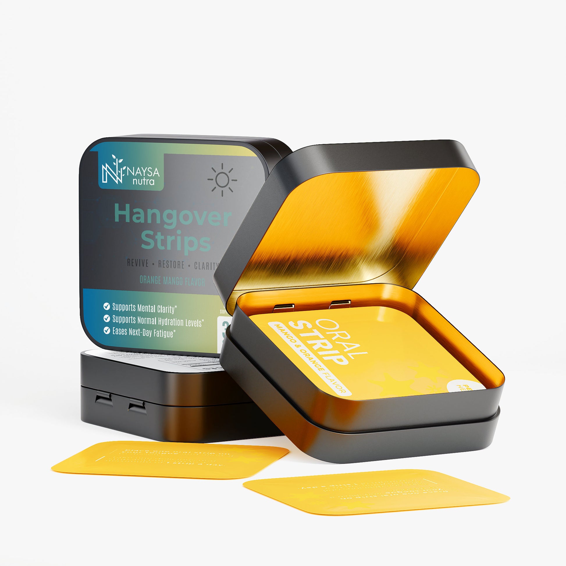 Delicious mango-orange flavored oral strips dissolve on your tongue, an easy, water-free way to support post-social recovery anytime, anywhere.